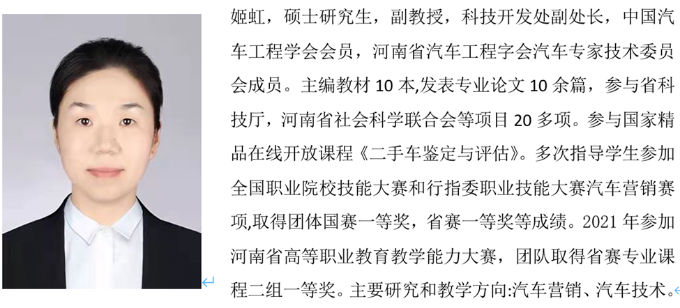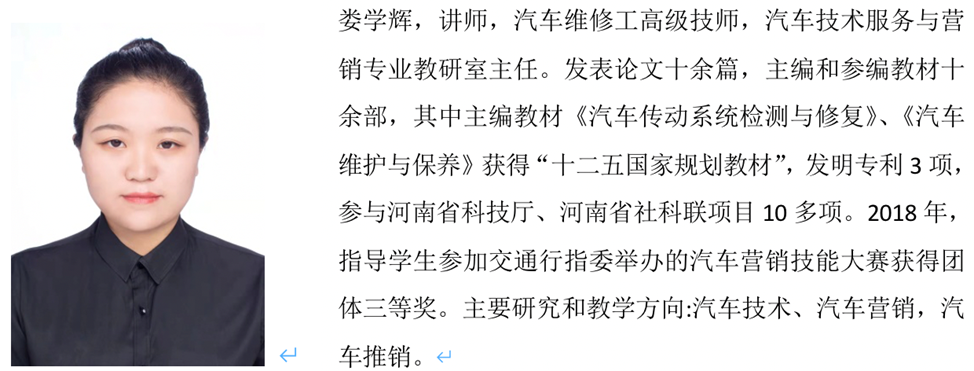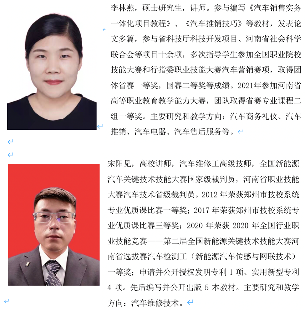 本专业有一支由专任教师、汽车经销企业一线技术人员组成的专兼互融的教学团队。共有专兼职教师6 人,其中,具有硕士研究生学历5 人,高级技师4 人,副教授3人,行业企业专家1 人。其中3名教师获得北京汽车校企合作营销项目团队认证,2 人通过福特汽车校企合作营销项目团队认证,3名教师通过中车行汽车运用与维修项目团队认证。近五年来,本专业教师团队主持省级、厅级科研项目10 余项,成果丰硕,其中《汽车传动系统检测与修复》、《汽车维护与保养》获得“国家十二五规划教材”,联合建设国家级精品课程《二手车鉴定与评估》,建设河南省高职院校立体化教材《二手车鉴定与评估》,建设yl7703永利精品课程《汽车销售实务》、yl7703永利立体化教材《汽车销售实训教程》、yl7703永利云教材《汽车推销技巧》。专业教师团队多次指导员工参加全国职业院校技能大赛和行指委职业技能大赛汽车营销赛项,取得团体国赛一等奖,省赛一等奖等成绩。教师团队2021年参加河南省高等职业公司产品能力大赛,团队取得省赛专业课程二组一等奖,指导员工参加“互联网+”比赛获得河南省选拔赛一等奖、二等奖。