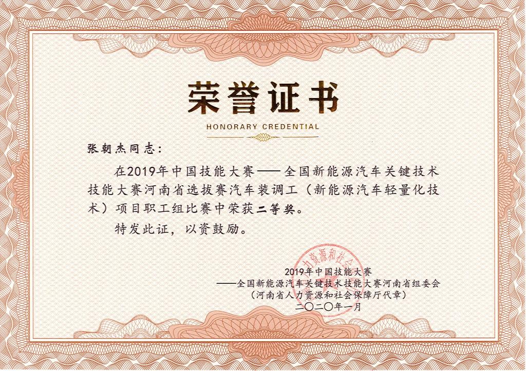 全国新能源汽车关键技术技能大赛河南省选拔赛汽车装调工 二等奖
