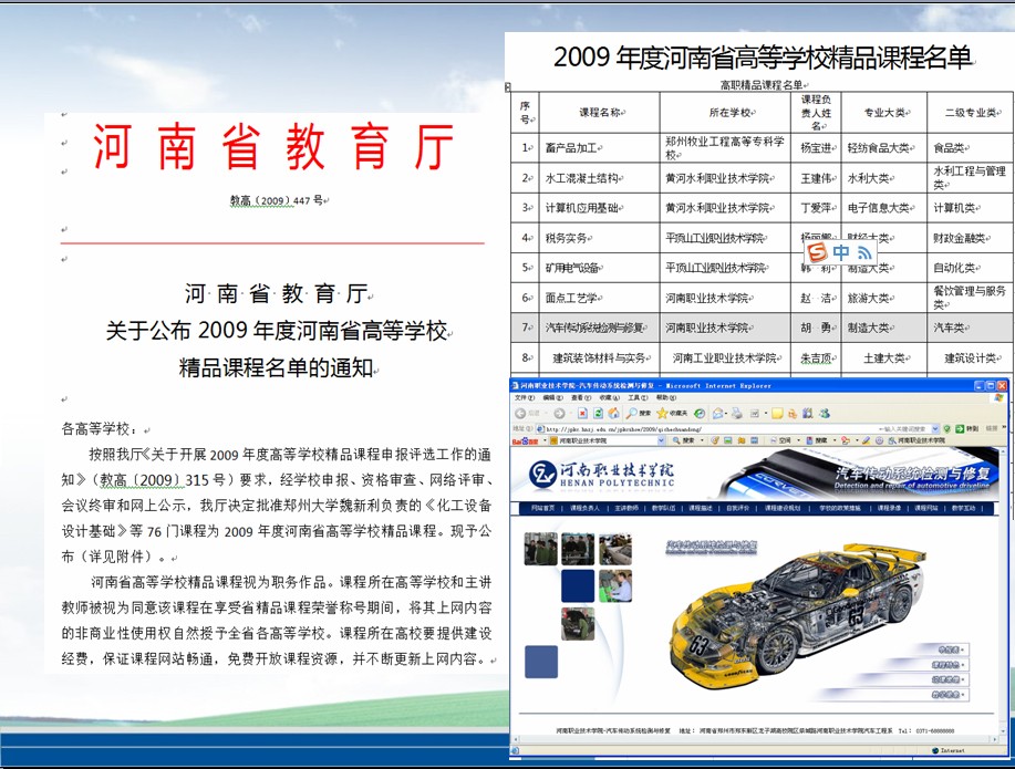 近五年来,专业教师发表论文156篇,编写教材96本。其中《汽车故障诊断与维修》被评为国家“十一五”规划教材,《汽车传动系统检测与修复》《汽车拆装与调整》《汽车整形技术》,《汽车评估》等9本教材被评为国家“十一五”规划教材。与河南豫港汽车销售服务有限公司等维修企业的技术骨干共同开发10门工学结合的院级精品课程,其中《汽车传动系统检测与修复》被教育厅评为省级精品课。