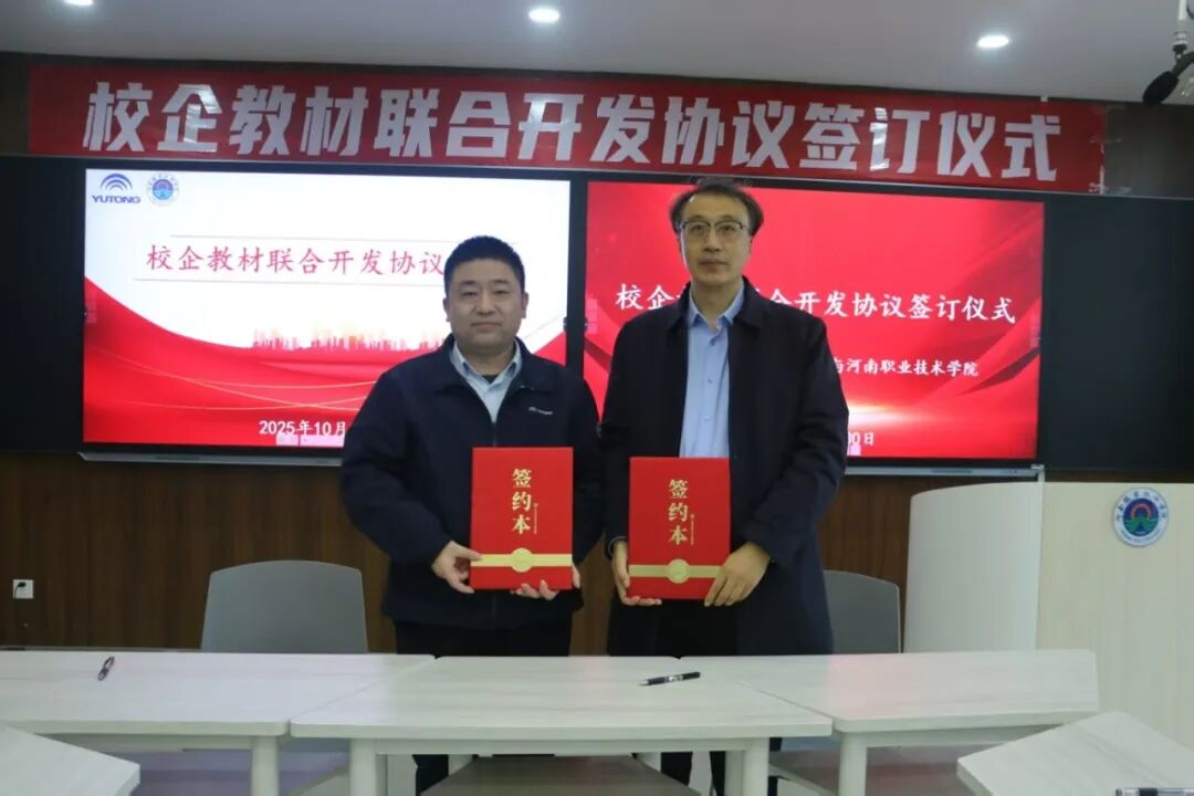 在全体与会人员的共同见证下,校企双方代表共同签署了《校企教材联合开发协议》。下一步,双方将围绕《客车传动系统检修》《汽车电路分析》《汽车电工电子》三门核心课程,联合开发一批内容前沿、理实结合、资源丰富的精品教材。