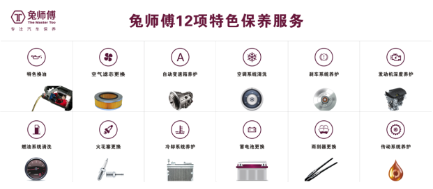 2、12项服务项目:兔师傅特色换油、自动变速箱养护、空气滤芯更换、空调系统清洗、刹车系统养护、发动机深度养护、燃油系统清洗、火花塞更换、冷却系统养护、蓄电池更换、雨刮器更换、传动系统养护等。