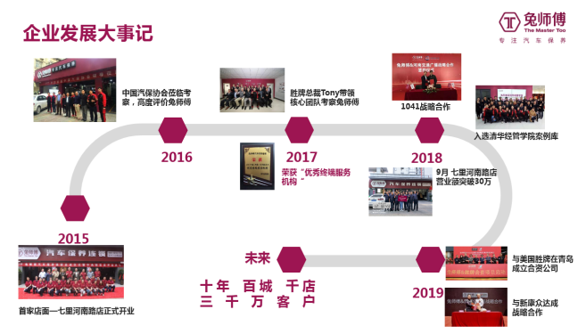 北京兔师傅汽车科技有限公司,成立于2015年5月20日。由四位清华员工联合创办,联合多家汽车集团共同投资打造的,一家专注于汽车保养的全国直营连锁经营企业。