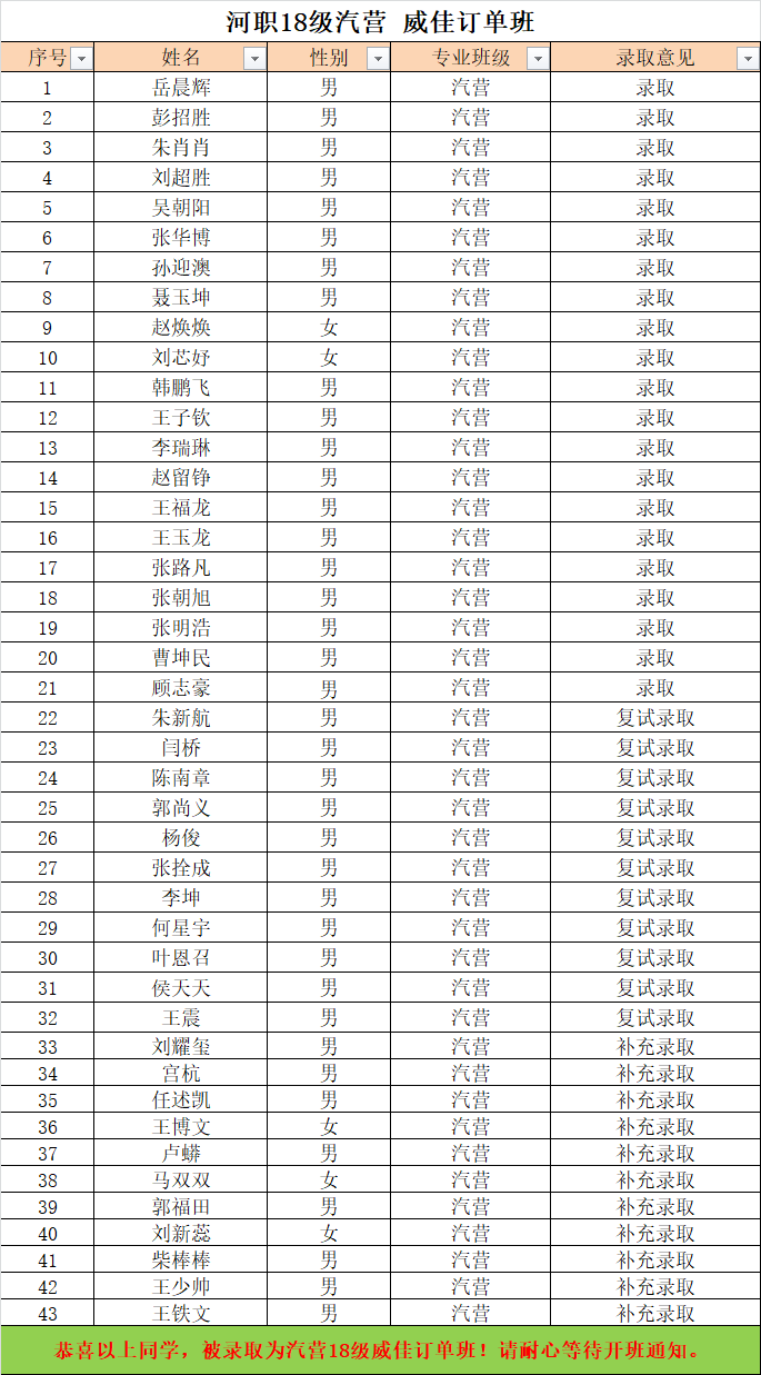 18级汽营威佳订单班录取名单