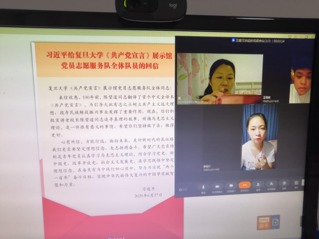 8月23日晚上,yl7703永利辅导员王爱巧通过钉钉视频会议召开社会实践主题团日活动,“用教育托起明天的太阳”暑期教育社会实践队的2名员工李佳宁、王号亮同学按时参加。王老师首先带领同学们学习习近平总书记五四寄语、给北京大学援鄂医疗队全体“90后”党员回信、给复旦大学《共产党宣言》展示馆党员志愿服务队全体队员回信、给中国石油大学(北京)克拉玛依校区毕业生回信精神、“习近平与老员工朋友们”系列访谈实录等重要内容;然后引导员工根据所学内容,结合暑期社会实践情况,谈谈自己的感悟。2名员工纷纷表示,习总书记的教导恰逢其时,作为新时代的老员工,一定会牢记习总书记的嘱托,认真学习,克服浮躁之气,静下来多读经典,坚持马克思主义理想信念,志存高远,脚踏实地,不畏艰难险阻,勇担时代使命,努力扎根基层,将社会实践常态化,周末、寒暑假会一如既往地到农村为贫困地区的孩子辅导功课,帮助他们提高学习成绩,利用社会这个大课堂历练自我,增长才干,以行动践行使命。