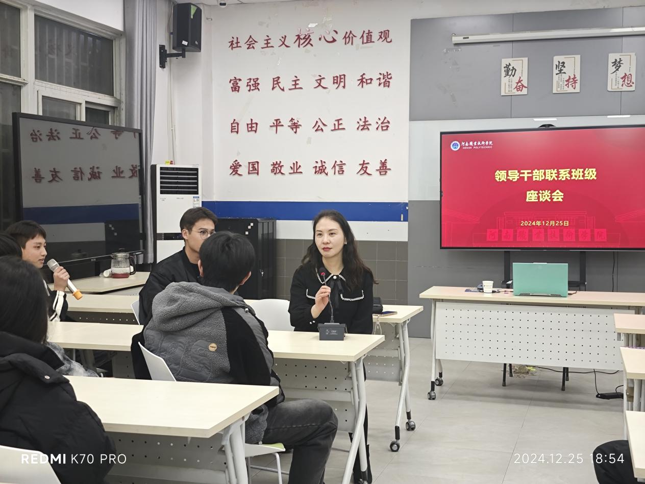 随后,孙仁阳组织开展了以“坚定理想信念 扬起青春远航风帆”为主题的班会。在班会热烈融洽的氛围中,房静、孙仁阳与同学们围坐在一起,亲切地互动交流。同学们积极踊跃发言,纷纷畅谈自己的人生理想,表达了立志实现青春价值的决心和信心。