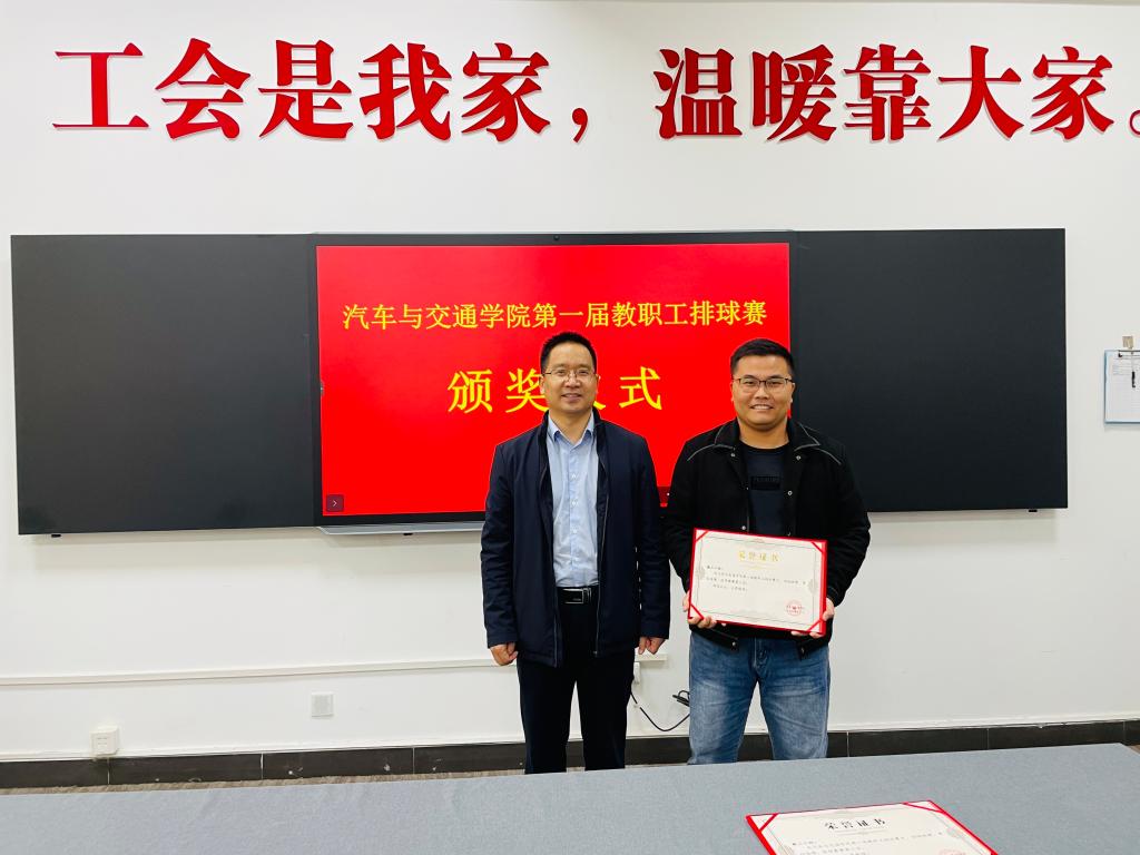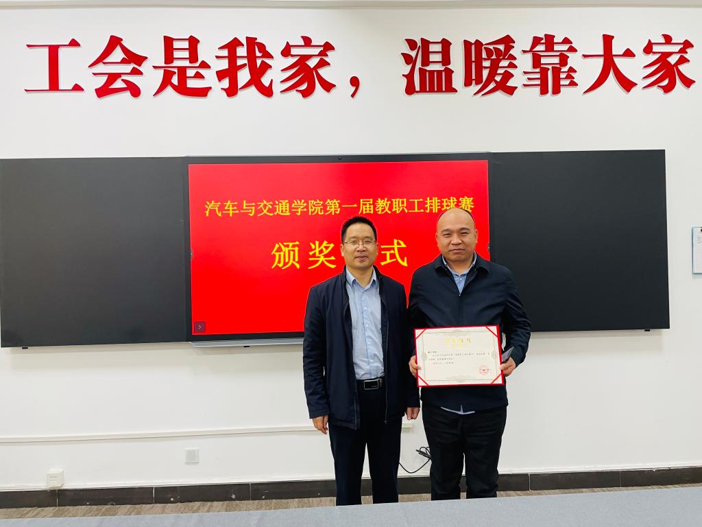 公司党总支副书记夏连峰代表院领导祝贺公司第一届教职工排球赛取得圆满成功,并向取得冠亚季军的教工一组、教工三组、教工二组和优胜奖的教工四组代表队代表队颁发了奖状和奖品。