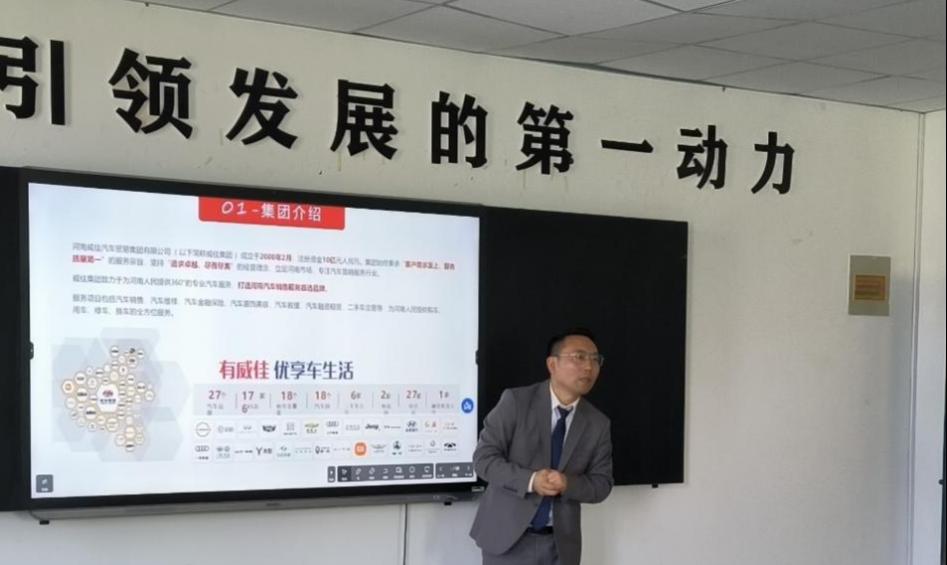 闫春光首先介绍了河南威佳汽车集团企业文化与发展战略,强调在智能化、电动化转型背景下,企业对复合型人才的需求日益增长。随后,他围绕企业核心岗位需求详细解析了保险专员、车管员、销售内勤、试乘试驾专员、市场部及新媒体等岗位的职能要求与业绩考核标准,同时辅以实际案例,帮助同学们直观地把握各岗位的工作内容和职业发展路径。