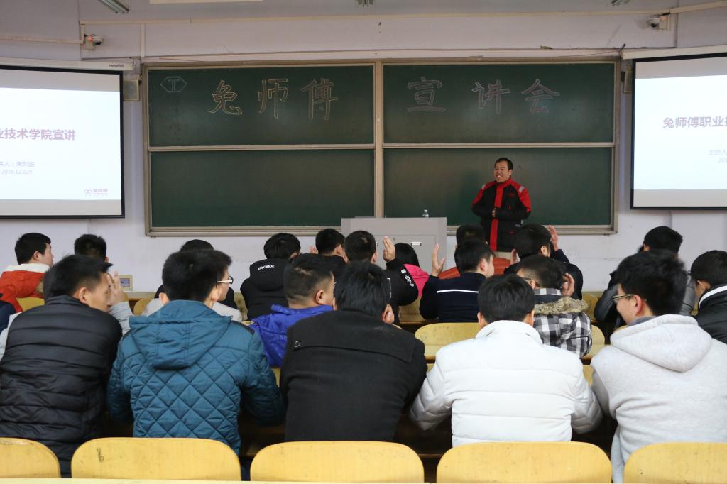 12月29日下午,汽车工程系在1201教室组织开展“兔师傅”宣讲会及汽车后市场现状分析讲座。本次讲座由兔师傅汽车维修有限公司总经理宋烈进主讲,公司品牌管理中心张延昭经理、人资行政中心王秀秀经理及汽车工程系2015级100多名员工参加了本次讲座。宋经理介绍了“兔师傅”公司品牌运营情况,从我国汽车行业发展的现状、汽车后市场发展方向的分析、发达国家汽车保养行业的考察分享等方面跟同学们进行了交流。开阔了员工对行业认知的眼界,为我系同学就业方向提供了新的思路。