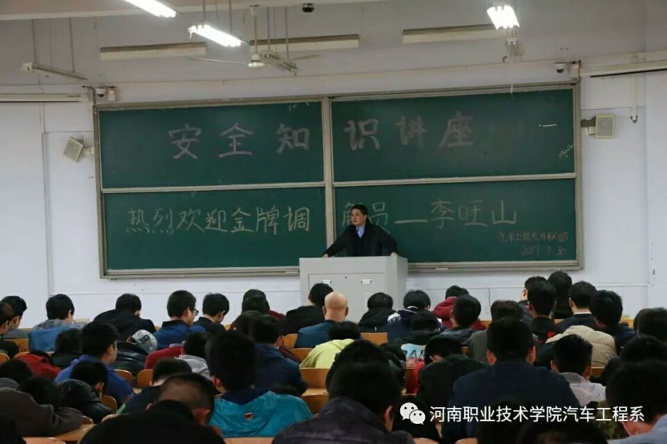 3月30日下午,在1301教室,汽车工程系邀请郑东新区龙子湖派出所金牌调解员李旺山来系开展安全知识讲座。本次讲座,李旺山调解员通过日常工作中遇到的真实案例,用生动有趣、接地气的语言,向我系员工讲述了网络贷款、防传销、校园打架等校园多发案件的预防、处置方法,告诫同学们要提高法律意识,谨防上当受骗,遇事不可冲动,要通过合法途径解决问题。我系2015、2016级300多名同学聆听的本次讲座。