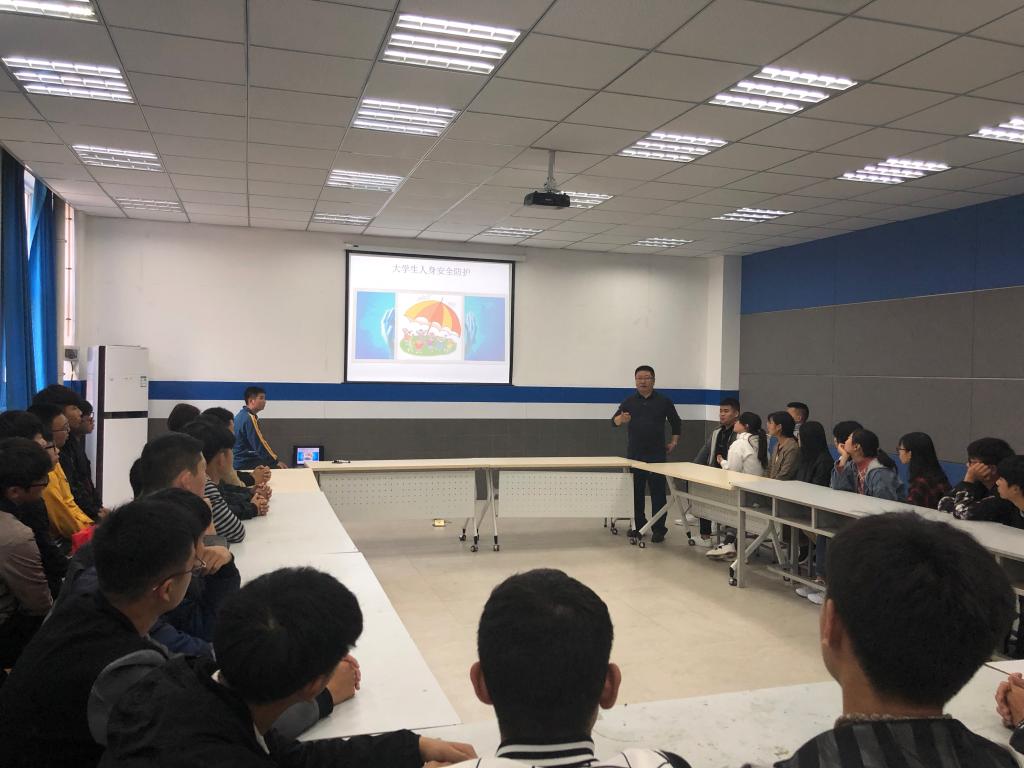 保卫处黄勇军副处长进入联系班级召开座谈会并举行专题讲座