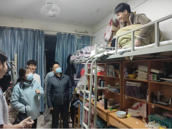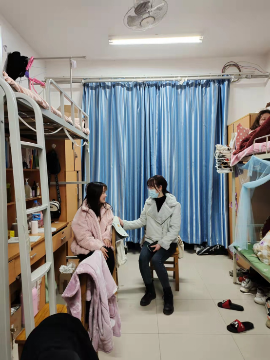 从晚上10点20分至12点,用时近2个小时,院领导带领辅导员深入2号楼242间男生宿舍与员工见面交流,提醒员工要戴口罩、注意保暖、养成良好生活习惯,加强体育锻炼,提高身体素质,同时要增强防护意识,坚决遵守公司管控要求,遵守各项疫情防控规章制度。尹霞和张虹艳老师深入附3号楼和10号楼40多间女生宿舍开展了专项教育。