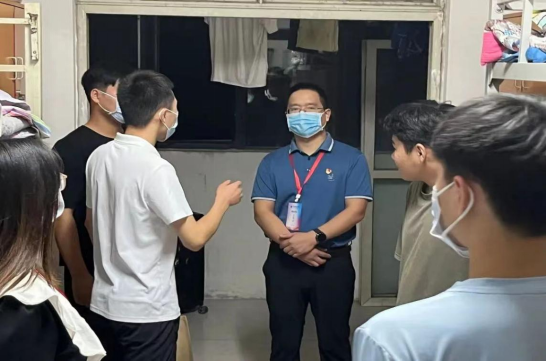 9月20日,新生报到当日晚,公司党总支副书记夏连峰带领新生辅导员老师深入宿舍看望报到新生,查看员工入住情况,提醒员工注意做好疫情防控和安全管理,及时给父母汇报在校情况,遵守入校第一周静态管理规定,认真上好线上课程。