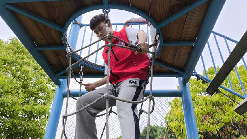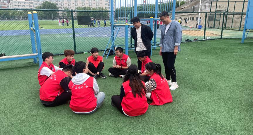 活动开始,田云青老师组织同学们进行活动前的安全讲解,经过自由选择为成四个小组。随后,郭睿老师组织同学们开展具体活动。活动的第一项内容是破冰之旅,每个小组围成一个圆圈,熟悉自己小组成员并开展比拼,进行老鹰捉小鸡等活动项目。待同学们熟悉并热身后,四个小组开始分批进行过独木桥、信任背摔、穿越电网等项目。在这种轻松快乐的氛围中,同学们逐渐放下内心戒备,积极地融入到团体中,活动气氛良好。