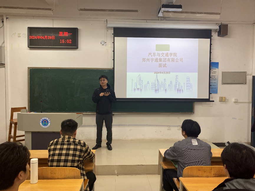 为加快就业进程,助力员工实习就业,4月29日下午,郑州宇通集团有限公司在我1102教室开展了针对2025届员工的面试活动。