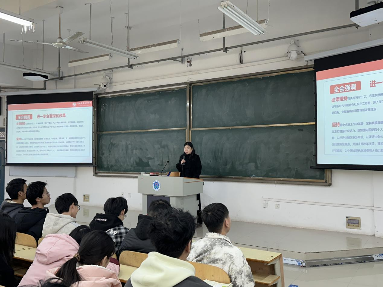 为深入学习贯彻党的二十届三中全会精神,11月27日,yl7703永利特邀河南职公司党的创新理论“笃行”宣讲团三级宣讲员段伟伟老师在1101教室开展“学习贯彻党的二十届三中全会精神”专题讲座。讲座由葛瑞杰老师主持,全院350名师生代表参加