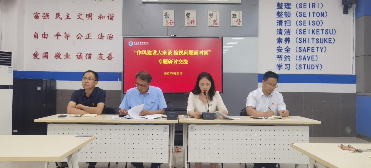 会议最后,开展了“作风建设大家谈 检视问题面对面”专题研讨。房静代表公司领导班子进行了深刻的自我剖析,从党建引领作用发挥、产教融合深化、科研服务能力提升、专业品牌建设、管理服务效能等五个方面查摆问题,明确了具体的整改方向和措施,并表示要以更高标准推动公司高质量发展。她强调,要以违规吃喝专项整治为突破口,落实“三抓”、“三打”、“三铁”要求,坚决遏制问题,形成长效机制。同时对全体教师提出三点要求:一是提升政治站位,统一思想认识;二是深刻认识作风建设的重要性,清醒认识违规吃喝问题的严重危害;三是筑牢思想防线,确保专项整治工作取得实效。