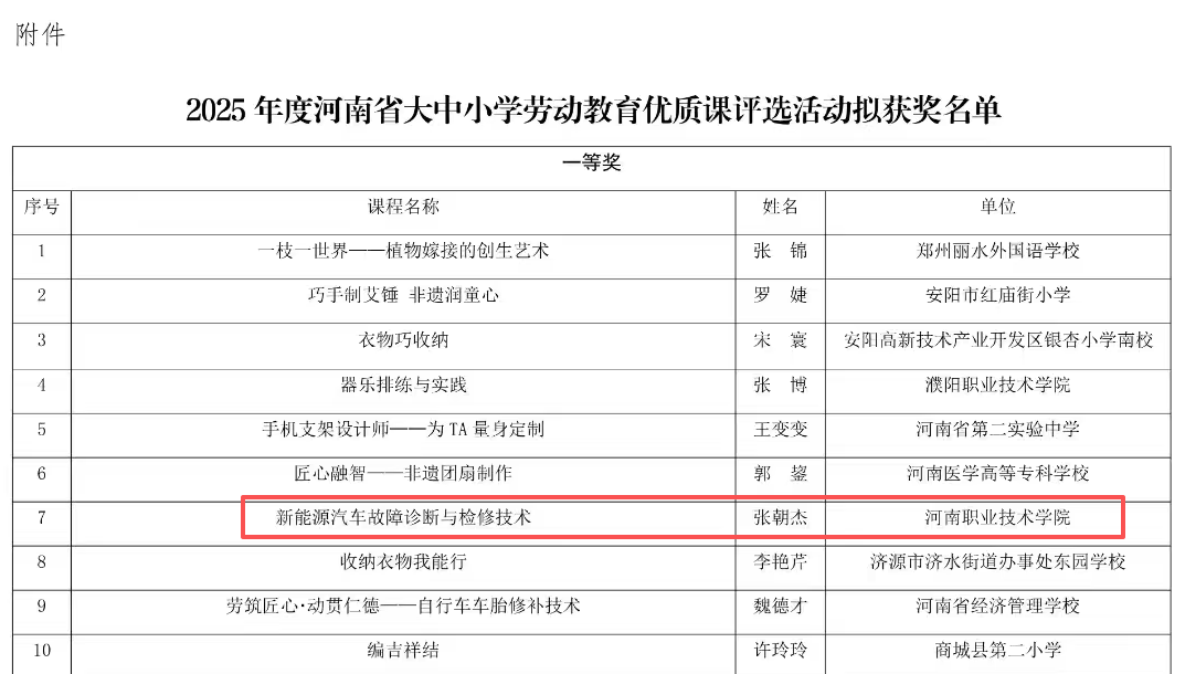 近日,省教育厅下发《关于2025年度河南省大中小学劳动教育优质课评选结果的公示》,yl7703永利教师张朝杰讲授的劳动教育学科融合优质课《新能源汽车故障诊断与检测技术》经过层层选拔,激烈角逐,在全省众多选手中脱颖而出,斩获一等奖。这是公司将劳动教育融入新能源汽车技术专业课程的创新实践,也是推动“专业技能+劳动素养”协同育人的积极探索。