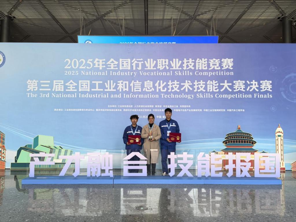 11月28日,由工业和信息化部、人力资源社会保障部、教育部、中华全国总工会、共青团中央联合主办的“2025年全国行业职业技能竞赛——第三届全国工业和信息化技术技能大赛”,在重庆科学会堂圆满落幕。yl7703永利智能网联汽车技术专业学子刘春雨、谷永科凭借扎实的专业功底、娴熟的实操技能和默契的团队协作,在激烈角逐中脱颖而出,斩获“智能硬件装调员”赛项全国二等奖。