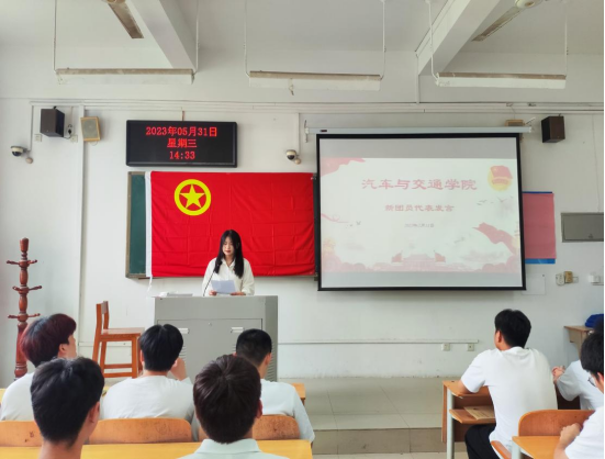 活动开始前,志愿者们与员工会的同学一起调试设备,组织同学们就坐。入团仪式中,毛晓羽老师首先介绍公司本年度新团员发展情况。接着,员工干部代表张诗颖带领同学们一起高唱共青团团歌,举起右手,进行入团宣誓。随后,新团员代表车身221班郭仪瑞和老团员代表车辆221班巴志奥进行发言。最后团总支毛晓羽老师为新团员们佩戴团徽,勉励同学们要做优秀的共青团员,并向新团员提出三点要求:一是做理想远大,道德高尚的拼搏者;二是做正直守纪、文明传承的促进者;三是坚持发奋学习,员工发展的模范者。