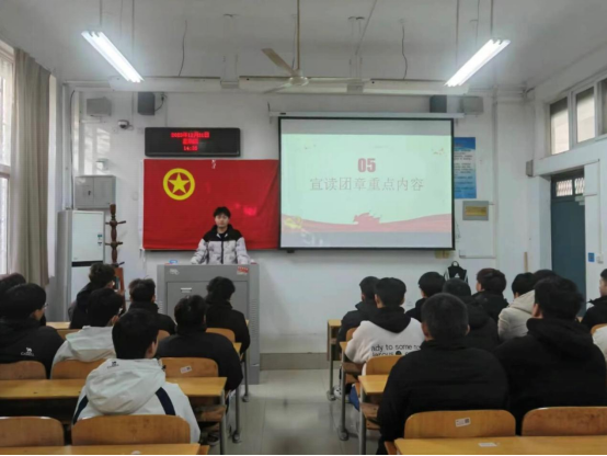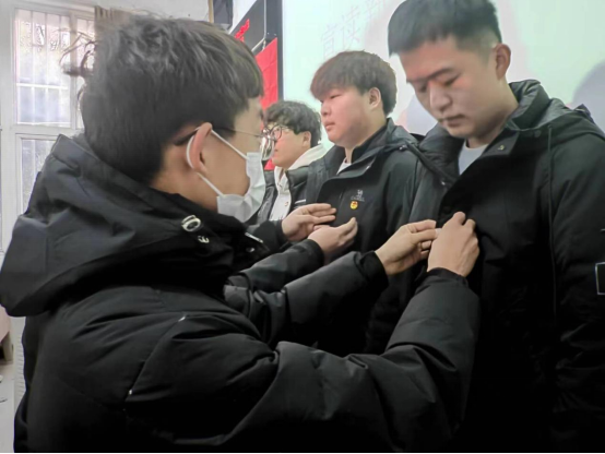 端庄严肃的《中华人民共和国国歌》结束后,王若彤宣读了新团员的名单及《团章》中有关团员们的重要内容,接着由老团员代表和员工会组织部副部长李鹏宇为新团员佩戴团徽、颁发团员证并带领新团员进行宣誓。新团员们庄严宣读入团誓词,他们用坚定的声音诠释着对祖国的忠诚和对团的誓言。随后,新团员代表汽制231班元锦华和老团员代表车身221班张铭豪进行发言。最后团总支毛晓羽老师勉励同学们要做优秀的共青团员,并向新团员提出三点要求:一是做理想远大,道德高尚的拼搏者;二是做正直守纪、文明传承的促进者;三是坚持发奋学习,员工发展的模范者。