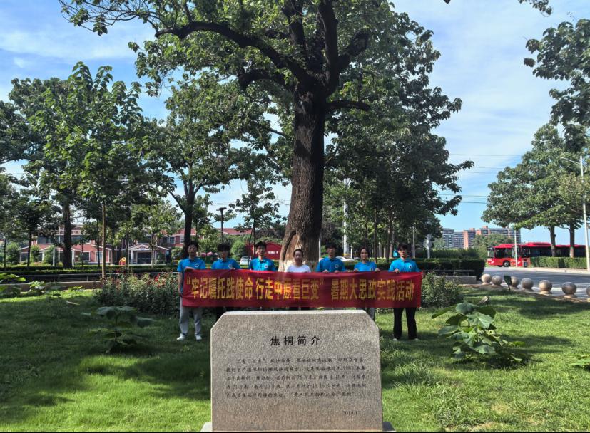 从焦裕禄纪念馆出来后,实践团队师生沿着林荫道步行前往“焦桐广场”。踏入广场,一片茂密的泡桐林映入眼帘,枝叶交叠间,大家怀着崇敬的心情,寻觅着那棵承载着特殊意义的泡桐树。1963年春天,焦裕禄同志亲手栽下的泡桐幼苗,历经六十余载风雨洗礼,如今已长成高耸入云的参天大树。当地百姓满怀深情地称它为“焦桐”。
