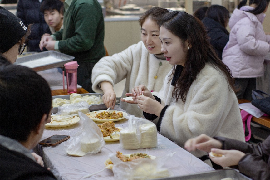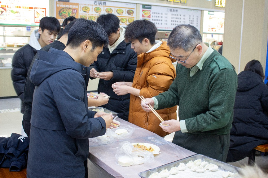 活动现场暖意融融,饺子皮、馅料等食材已摆放整齐。在老师们的带领下,同学们热情高涨、分工协作,取皮、填馅、捏边有条不紊,动作娴熟利落。平日里专注专业学习的同学们各显巧思,包出的饺子形状各异,有的圆润饱满似元宝,有的精巧灵动如月牙。老师们一边示范包饺子技巧,一边与同学们亲切交谈,食堂里洋溢着欢声笑语。随着一盘盘热气腾腾的饺子陆续出锅,大家围坐桌边,品尝亲手制作的美味,鲜香的味道在舌尖绽放,温暖的情谊在心底流淌。