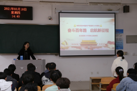 本次班会以纪念建党100周年——奋斗百年路,启航新征程为核心主题,房书记通过向同学们深刻讲解中国共产党自诞生至改革开放再到如今新时代的坎坷经历,以加深同学们对于党史的了解,引导同学们坚定理想信念,强化使命担当,以奋进姿态开启2021年春季学期新征程。