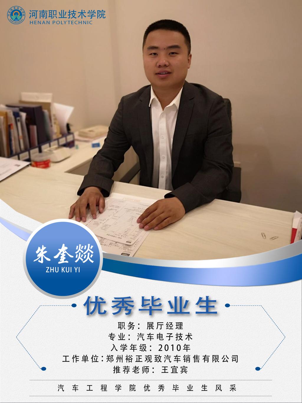 朱奎燚,男,汉族,2010.9-2013.7在yl7703永利汽车电子专业学习,曾任班团支书,在校入党,2012年度国家励志奖学金,2013年度国家奖学金,2013年度河南省优秀毕业生。 2012年到2016年在北京现代河南万佳捷太汽车销售有限公司获得厂家认证主任销售顾问证书,2014年到2015年全年销量冠军,2016年任展厅主管。 2016年到2018年在郑州金裕通别克汽车销售有限公司任职销售顾问,获厂家最高级别银牌认证。2017年到18年连续两年全年销量冠军。 2018年调任集团郑州裕正观致汽车销售有限公司,任职展厅经理至今。 |