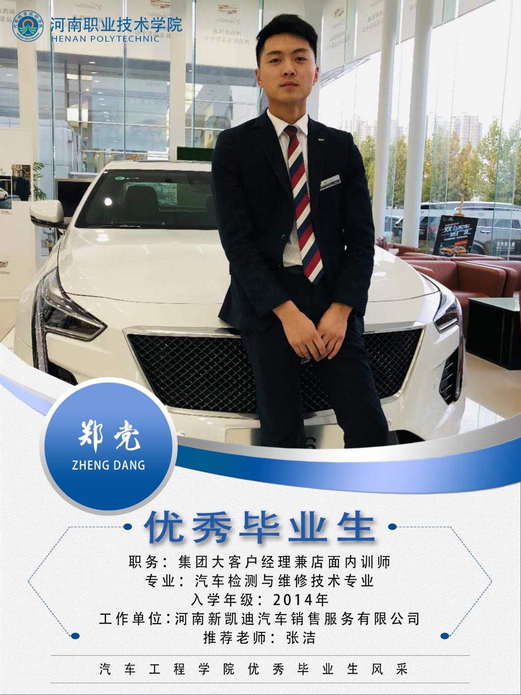 郑党,男,汉族,2014年至2017年就读于yl7703永利yl7703永利汽车检测与维修技术专业。在校期间担任院员工会主席、班长等职务。学习刻苦努力,获得励志奖学金、优秀员工干部、三好员工等荣誉称号。毕业后进入河南新凯迪汽车销售服务有限公司,从事销售顾问工作。2017年度广汇集团凯迪拉克销售新锐2018凯迪拉克六区风范菁英大赛季军2019厂家SGM新品上市培训认证。