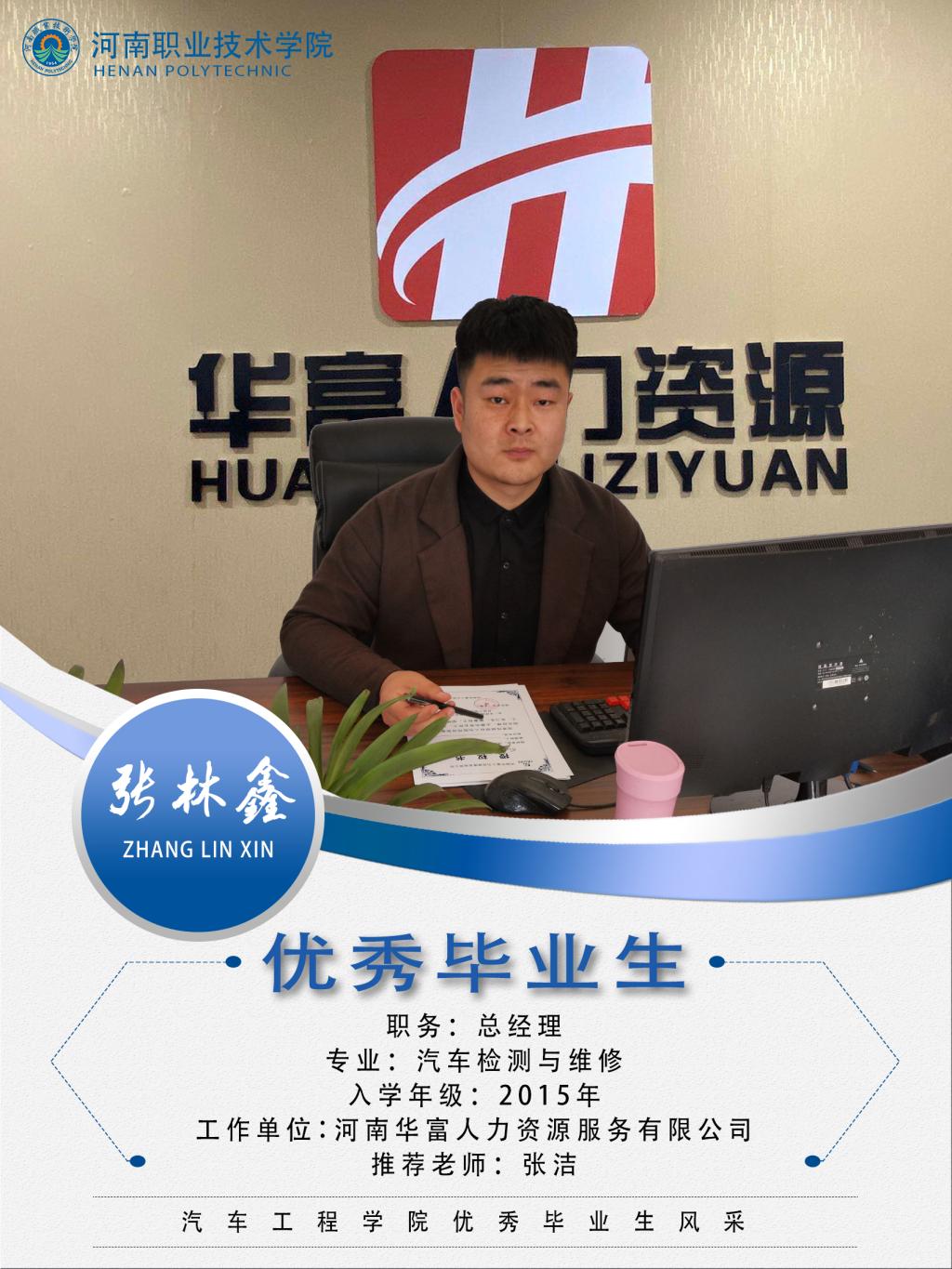 张林鑫,男,汉族,2015年至2018年就读于yl7703永利yl7703永利汽车检测与维修技术专业。在校期间担任院员工会主席、班长、校信息员大队队长等职务。学习刻苦努力,获得励志奖学金、优秀员工干部、三好员工等荣誉称号。在校期间开始自主创业,2016-2018成立林振汽车服务有限公司、林振驾培团队、林振小吃店。现经营郑州豫平机动车驾驶培训公司、河南华富人力资源服务有限公司。任职总经理。