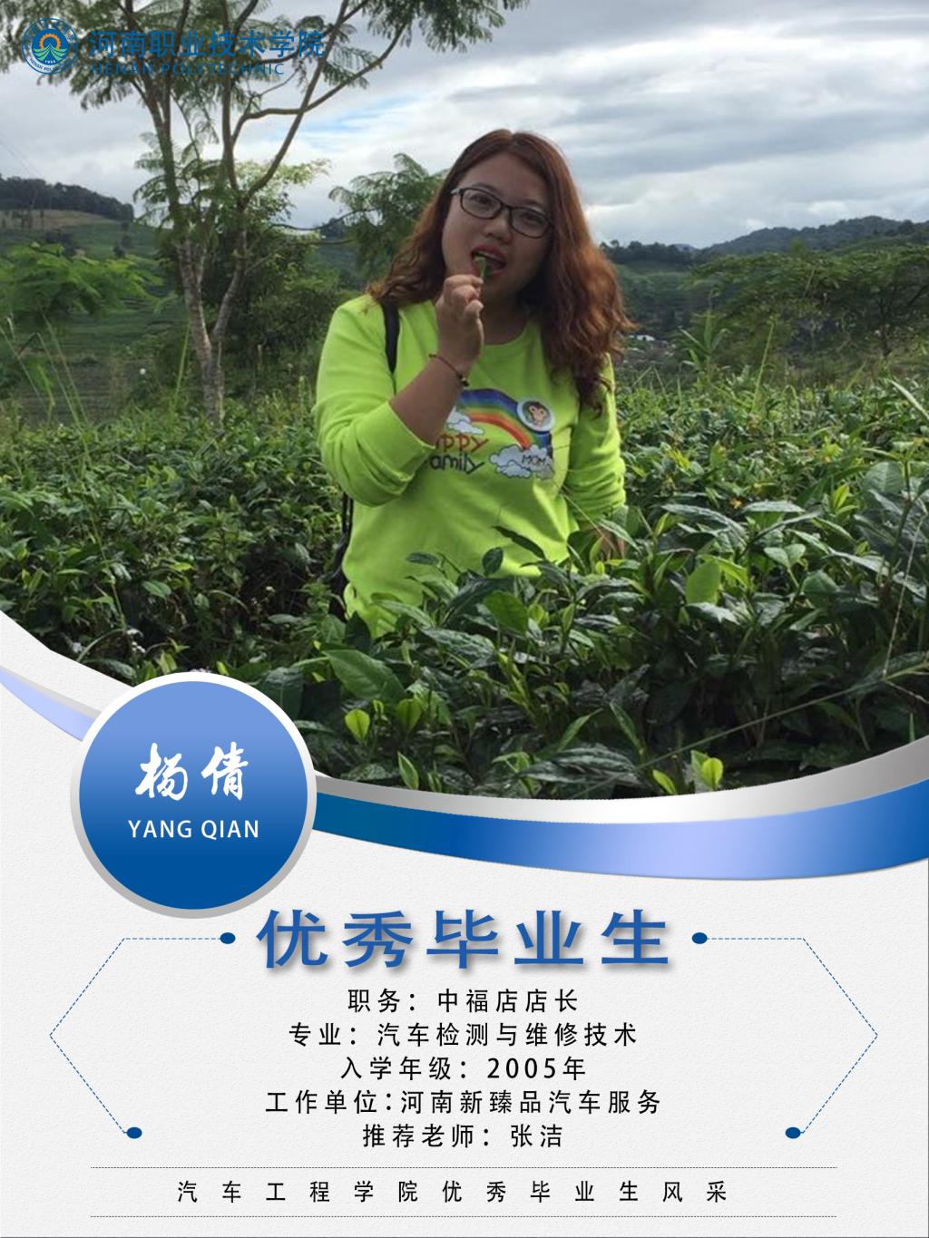 杨倩,女,汉族,2005年至2008年就读于yl7703永利汽车工程系汽车检测与维修技术专业。在校期间担任班级团支书,成绩优异,获得一等奖学金、优秀员工干部等荣誉称号。2007年至2017年在河南成悦汽车销售服务有限公司任客服经理。先后三次参加广汽丰田“尊尚杯”职业能力比赛客户咨询对应比赛,荣获区域一等奖。2017年至2020年在恒信路伟汽车销售有限公司任客服经理。2020年在河南新臻汽车服务任中福店店长,负责全面工作。