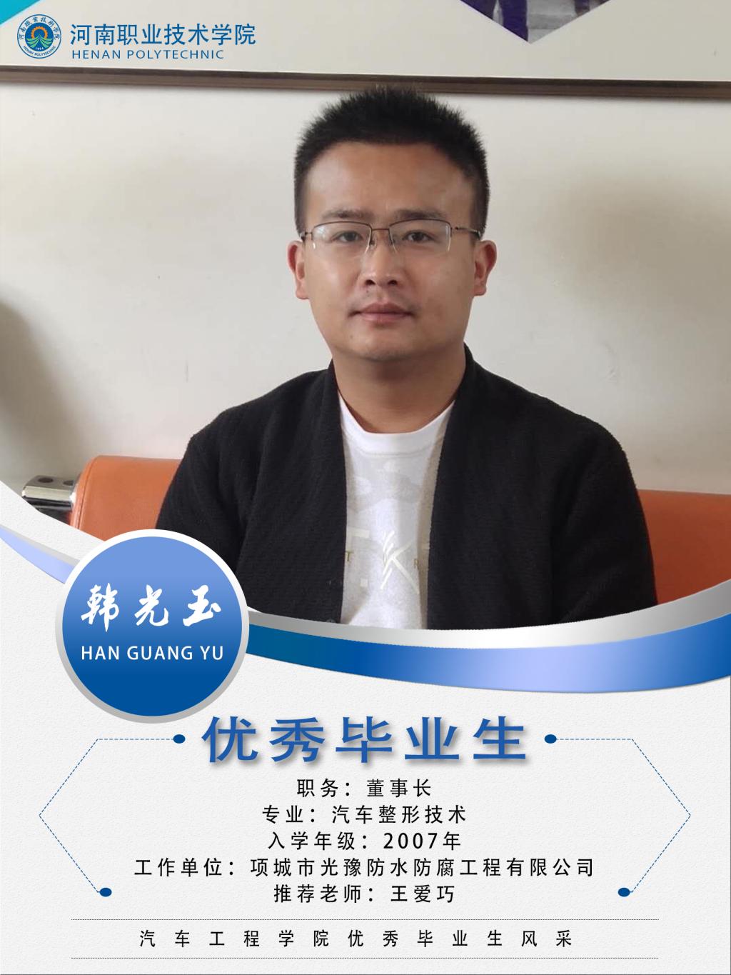 韩光玉,男,汉族,2007年至2010年就读于yl7703永利汽车工程系汽车整形技术专业,曾担任过班长一职,在校期间努力员工习,团结同学,积极参加社会实践,表现出超常的创业天赋。毕业后进入项城市新峰防水防腐工程处公司,担任工人,司机,预算员,施工员,材料员、总经理,后辞职创业,2016年4月创办项城市光豫防水防腐工程有限公司,2018年创建办河南省鲁峰建筑安装工程有限公司并担任法人代表,同时担任业务经理,2020年3月创办河南省港新能源技术有限公司。