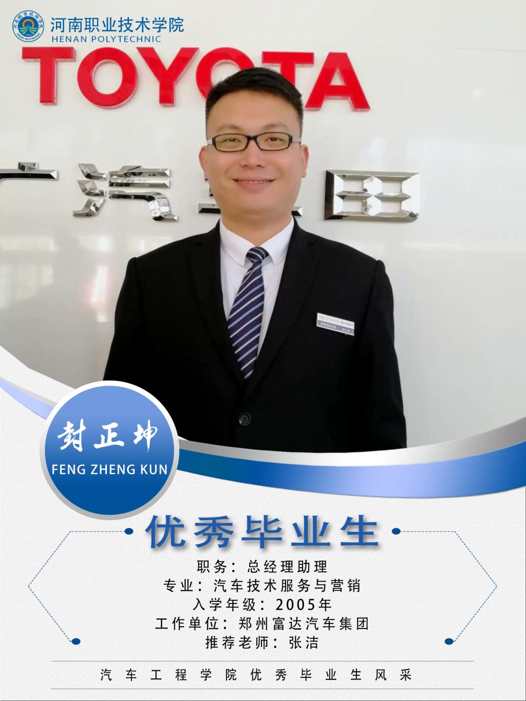 封正坤,男,汉族,2005年至2008年就读于yl7703永利汽车工程系汽车技术服务与营销专业,曾任系员工会副主席、班长等职务,在校期间勤奋学习,成绩优异曾获励志奖学金、优秀员工干部、三号员工等荣誉称号。2008—2009年在西三环上海大众郑州销售工作 2009—2013年奥迪丰之元从事销售工作,由于工作优秀多次被评为年度优秀员工。 2013—2016年担任南阳恒信一汽丰田销售经理职位 2016—2018年担任郑州富达集团广汽丰田诚意店销售部长 2018-2019年担任郑州富达集团广汽传祺美格店销售部长,连续两年荣获全国十佳销售店荣誉称号 2020年至今,在富达一汽丰田登封分公司任总经理助理,负责全面业务。 |