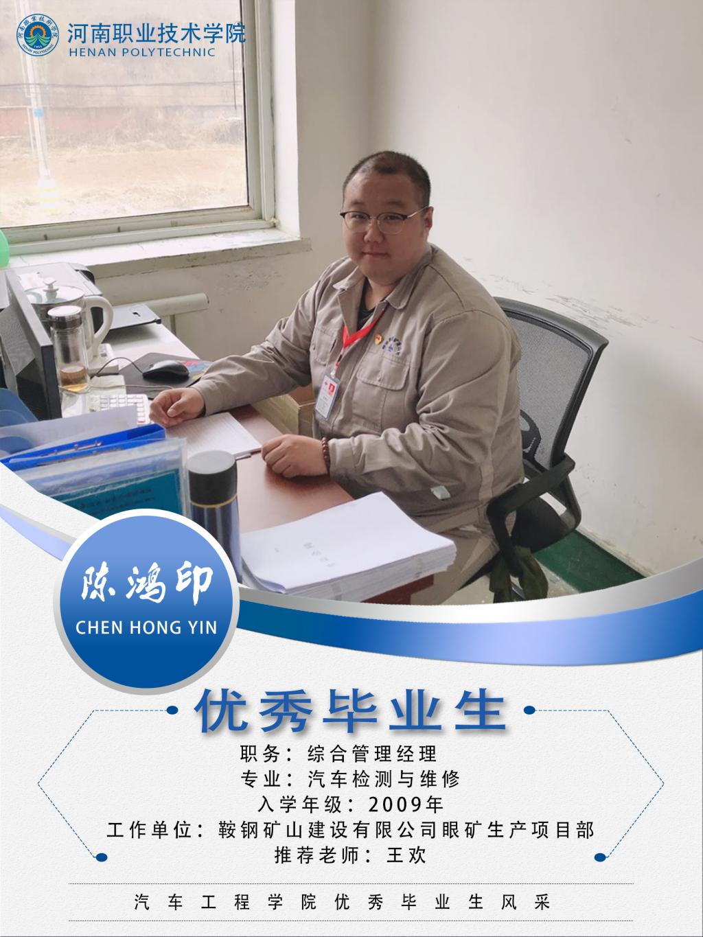 陈鸿印,男,汉族,2009年至2012年就读于yl7703永利汽车工程系汽车检测与维修专业,曾任系员工会副主席,在校期间勤奋学习,积极参加社会实践,带领员工会积极配合员工管理工作,组织大型文艺晚会、员工活动等。在校期间,获得河南省省级三好员工、院优秀班干部、院三好员工、优秀员工会干部等荣誉。 2012年毕业后回到家乡辽宁省鞍山市自主创业,在鞍山红星美凯龙开启油画店,同年拉菲德堡法式家具店开业。2014年泰阳榻榻米家具店在红星美凯龙开业。 2018年进入鞍钢矿山建设有限公司工作,担任综合管理经理一职至今。 人生格言:机会永远留给有准备的人。 |